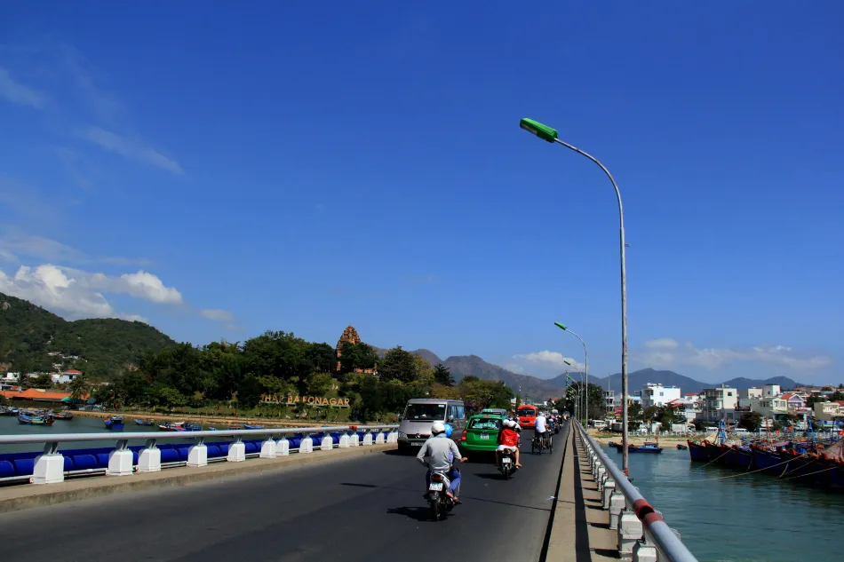 往湄公河入海口的地方望去,有一座高耸的大桥,我提议去那个地方看看。
